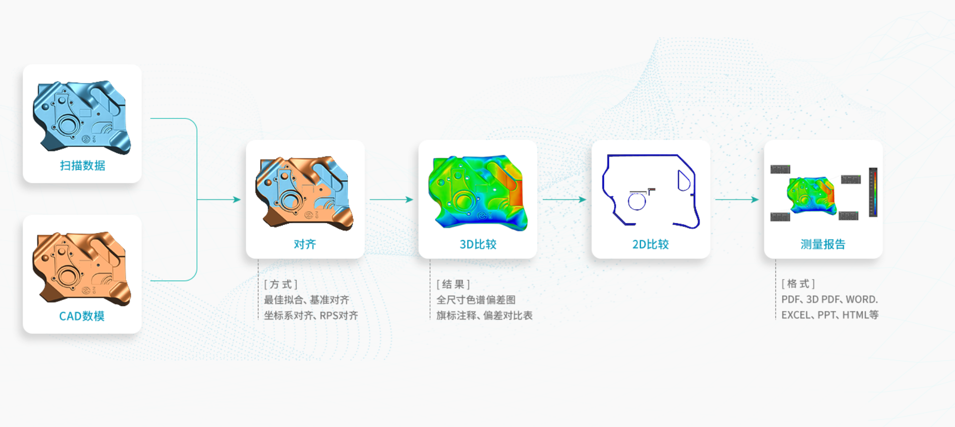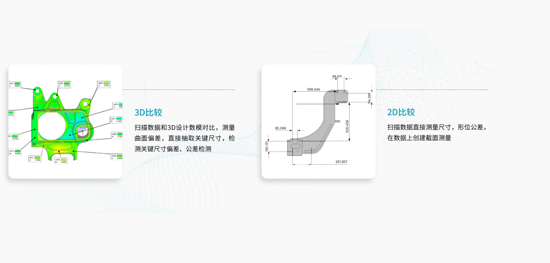 制造业是国民经济的主体,工业零部件质量的好坏是直接影响制造业产品使用性能的重要因素之一,面对越来越激烈的市场竞争,工业零部件生产使用三维扫描来提升技术优势,从而提高产品质量和缩短生产周期等,将成为一种必然。工业零部件的形状比较复杂,有些底面、内部凹槽形状各异,曲面轮廓较多。使用传统的测量方法,如检具、治具、三坐标等,不仅十分繁琐、耗时,而且不易对零部件的结构进行准确、快速地测量、检测。三维扫描技术的出现,给工业零部件检测带来很大方便。它可在不对扫描工件造成磨损破坏的前提下提供可靠、真实的三维数据信息;可将得到的三维数据与三维图纸进行比对,快速准确地获取工件各个位置的偏差,从而基于比对结果给出修正方案;对于扫描死角少,复杂的曲面,同轴度,圆柱度等用传统方法难以获取检测的数据,也都可以轻而易举地获取;同时,快捷的扫描也可以提高检测的效率,减少时间和人力成本。